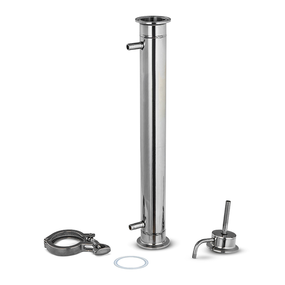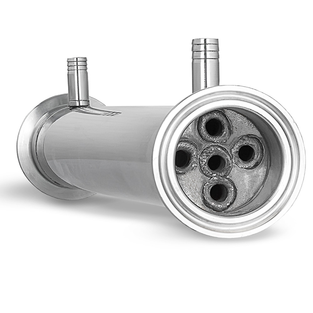 The boiler-type (film-type) type cooler is made of food grade stainless steel, which guarantees safety of use and durability. The structure is a hollow pipe with a flange for a clamp connection on one side, and a fitting for collecting the finished product on the other, between them are installed four tubes (boiler) with a diameter of 6 mm and a length of 300 mm each, the cavity around which is reliably insulated by two jumpers. Through the connected hose to supply cooling to the choke, cold water enters the tubes of the boiler, effectively cools the alcohol-containing vapor passing through them, resulting in a condensed alcohol solution.