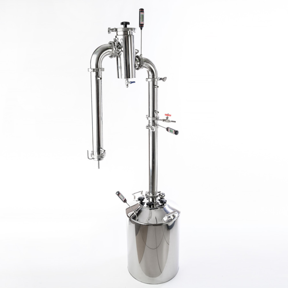 Modules of Gorilych are made of food grade stainless steel, the factory warranty is 1 year. Distillation cube has a wide neck with a diameter of 110 mm, which facilitates the maintenance of equipment. Also on the cube, you can install a safety valve, it will drop the excess pressure into the atmosphere, if for some reason the device clogs and the pressure in the circuit starts to grow. Thermometers are included in the standard delivery package to monitor the parameters of the column. Hoses, adapters, hydrometers can be purchased at checkout.